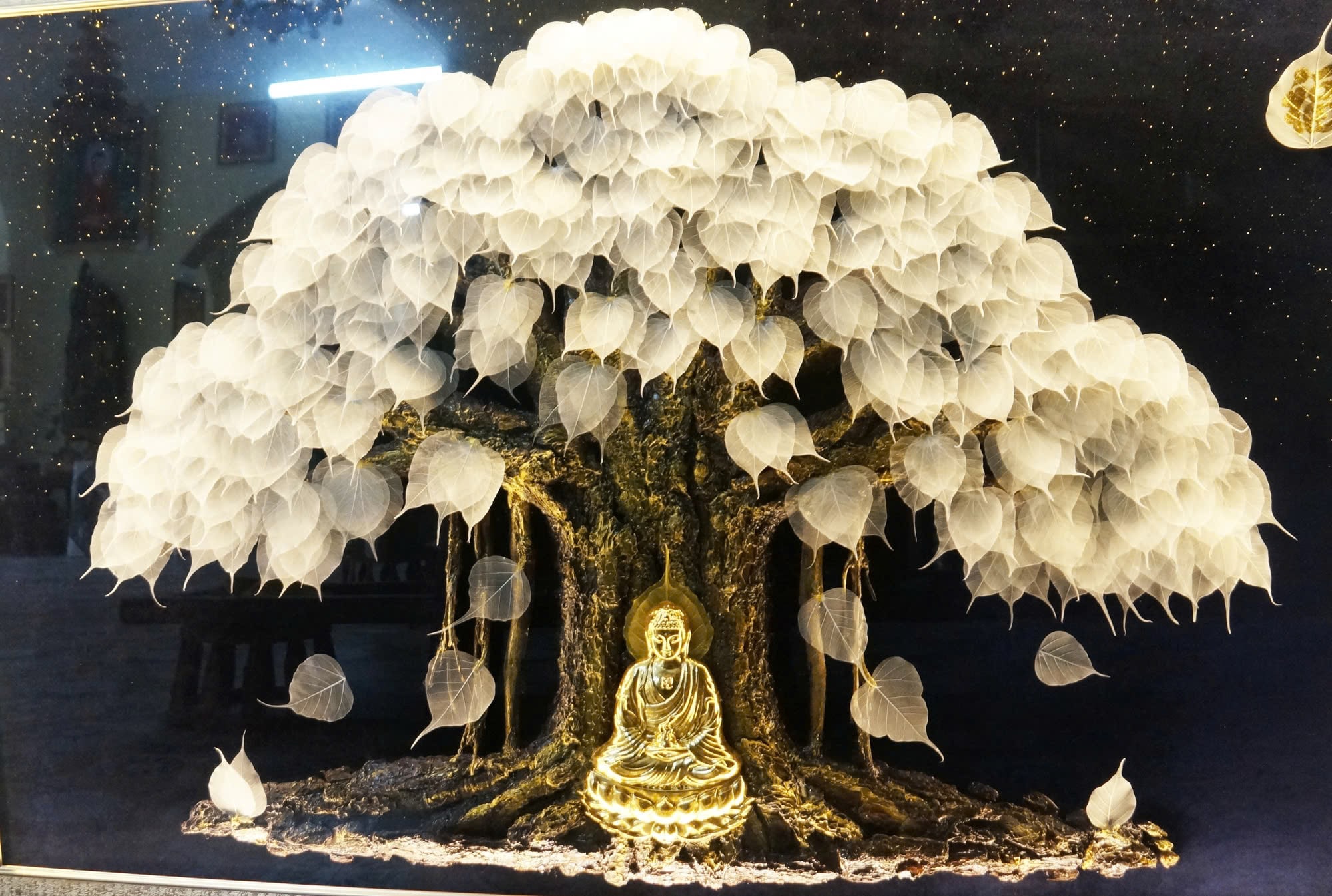 Bức tranh phác họa đức Phật ngồi an toạ tìm ra con đường giác ngộ và chân lí cho nhân loại . Tranh lá bồ đề là tác phẩm được làm rất kì công và tâm huyết của các nghệ nhân