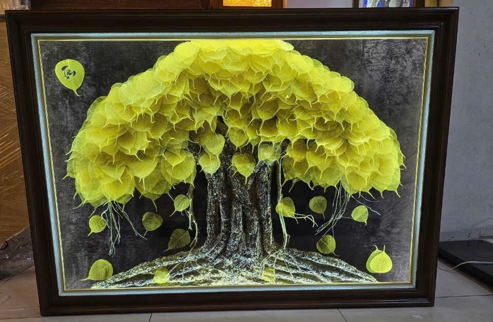 tranh lá bồ đề  là  tranh  được tạo ra từ xương lá bồ đề, biểu tượng của sự an lành trong Phật giáo. Các lá được sắp xếp tỷ mỉ dưới bàn tay nghệ nhân, tạo ra sự hài hòa, tinh tế  – biểu tượng của niềm tin. trong Phật giáo không chỉ là một tác phẩm nghệ thuật, mà còn là biểu hiện của sự thiền định, của sự kết nối sâu sắc giữa con người và thiên nhiên. Bức tranh này không chỉ mang lại sự thanh tịnh và yên bình cho không gian sống mà còn là món quà đầy ý nghĩa, gửi gắm lời chúc phúc về sự an lạc và hạnh phúc.